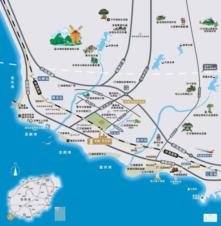 九所占据三亚西核心C位,四大湾区环绕,海陆空多维立体交通;本案距三亚国际机场60km,乐东覆盖尖峰、黄流、乐东3大高铁站,其中乐东站依偎在旁,出行方便;