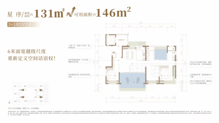 户型建筑面积约99-143平米,户户均拥有独立全明电梯厅,且可用面积约为109-163平米,是第四代高得房光幕奢宅。