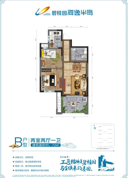 (碧桂园海逸半岛B户型 两房两厅一卫 建筑面积 72㎡)