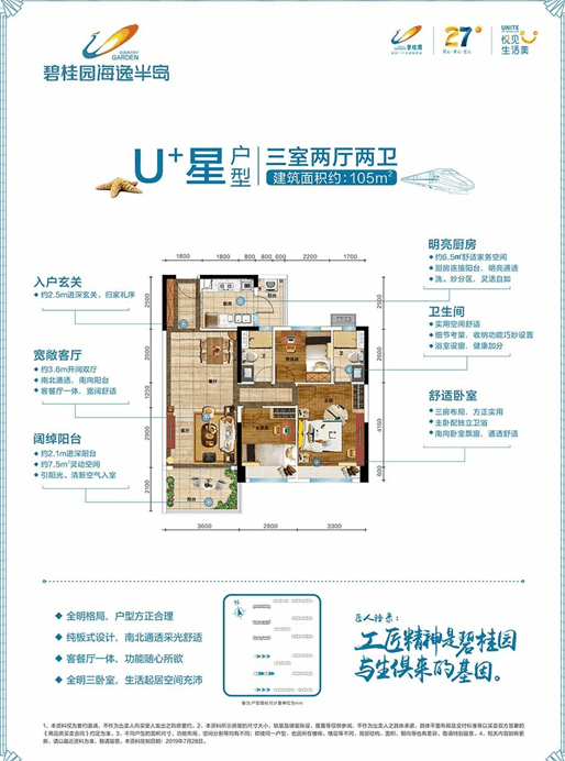 (碧桂园海逸半岛U户型 三房两厅两卫 建筑面积约105㎡)