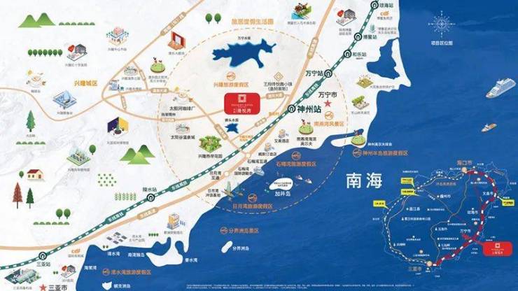 中南漫悦湾坐落于海南万宁兴隆镇,这个被誉为“多彩万宁”的地方,不仅拥有得天独厚的自然风光,还享受着海南岛东轴芯的地理位置优越。项目距离东线高速仅1公里,距离神州高铁站2公里,小区门口即有公交站牌,交通十分便利。无论是自驾出行还是乘坐公共交通,都能轻松抵达海南岛的各个角落。