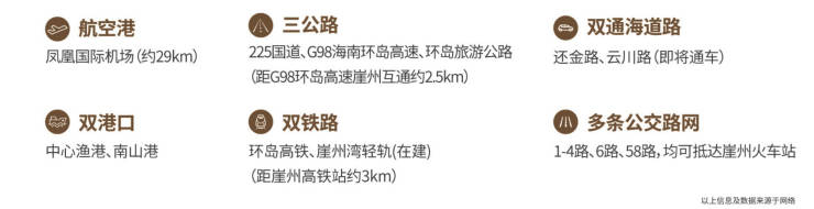 区域内享崖州古城,及周边南山寺、大小洞天、天涯海角等5A级景区旅游资源,出门即度假。