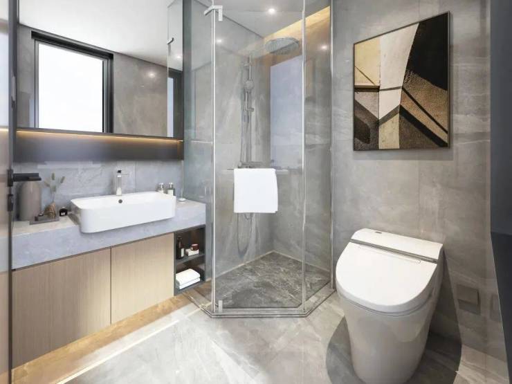 独立卫浴空间,借鉴了高端酒店的设计风格,采用相互独立的双台盆设计,彼此陪伴但又保持适度的距离。贴心配置智能浴缸,当夜幕降临之时,浴缸里来一次身心浸泡,静静眺望窗外的夜色,享受属于自己的片刻时光。淋浴房设计,摈弃臃肿挡水条,极窄边框的玻璃隔断,实现了空间通透感的最大化。严选天然石材墙面,淋浴屏地面抽槽工艺,每一个细节都沉淀着对精致生活的巧思。