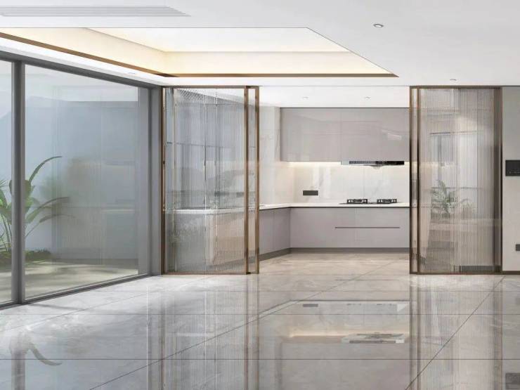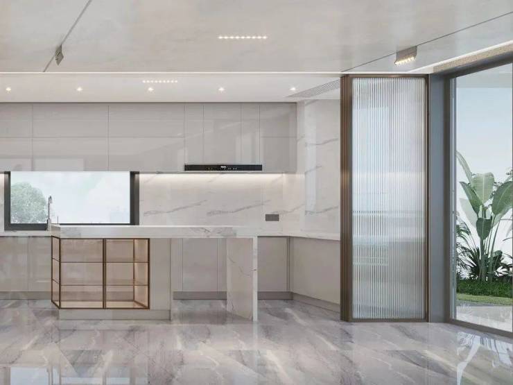 白色石膏板吊顶内嵌东芝中央空调、预留双开门冰箱位、吊柜嵌入式灯光等细节设计,映射出高品质的生活方式。