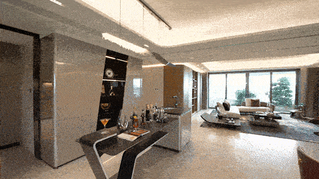 餐厅区与中岛吧台打通,与客厅链接成流畅、开放的格局,彰显出大平层的空间尺度。中岛吧台在去繁就简的基调中,以美为引,简约大气的几何造型吊灯与吧台造型相呼应,层次感与趣味性随即而出。台面安装上下水,杯具、水果和蔬菜可以分区清洗,节省走动距离。