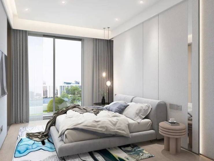 步入主卧套间,舒适的视觉尺度及生活维度无处不在。精选的材质、简约的布局与精致的配色,相得益彰,营造沉静深邃的氛围。