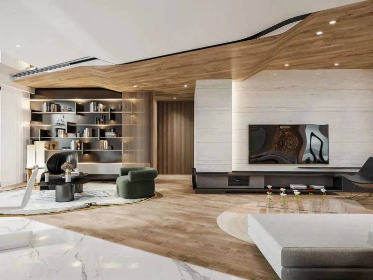 曲线在视觉上要比直线更加具有亲和感,居住其中的人心境也会更趋于平和。流畅的弧形造型墙面,消除单纯直线形式的乏味,温润过渡空间界限,让空间所生的既得情绪更加丰厚且活泼灵动。