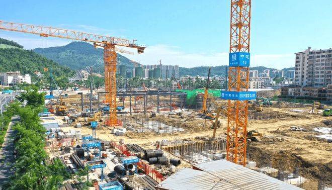 项目工地内,一派热火朝天的开干状态,有挖土机、吊臂、打桩机等重工机械,还有不少工人在作业。