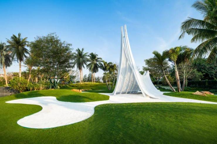 公园以艺术化手法构造如海浪般起伏的肌理,布局了艺术景墙、月舟、水系、热带风情绿植等景观节点,极具视觉效果和触感体验。屹立在公园中央的“月舟”,外形如同双手合十向上祈愿,空间下宽上窄,方寸间展现了力与美的结合。