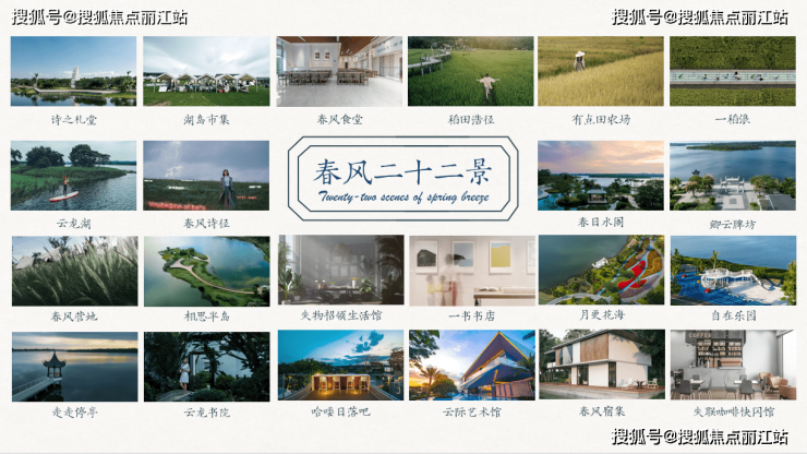 园区涵盖月更花海、卿云牌坊、相思半岛、春风营地、诗的礼堂、泡泡廊架、春日水阁、走走停亭、自在乐园等二十二大功能区,满足全家庭湖居生活需求。