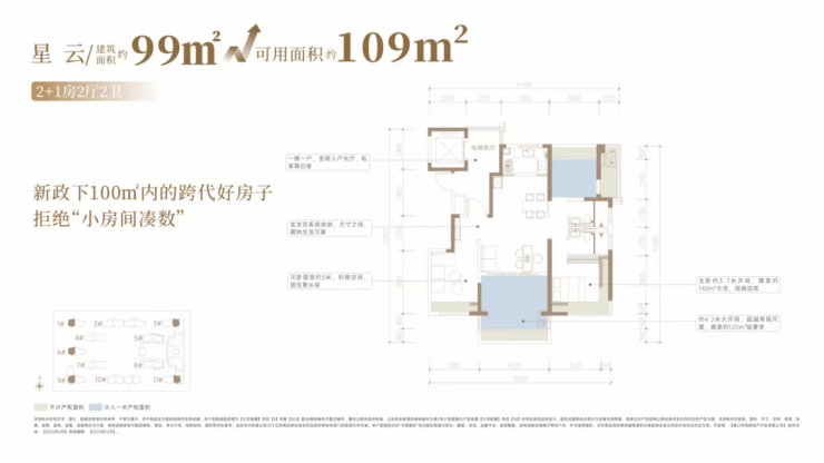 户型建筑面积约99-143平米,户户均拥有独立全明电梯厅,且可用面积约为109-163平米,是第四代高得房光幕奢宅。