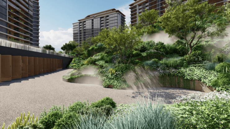 项目通过一个仪式中轴、两大核心庭院、六个宅间庭院的空间格局依次打造林间、水苑、绿台、山囿、森海五大主题场景。结合社区入口景观打造多层次热带水景、造型椰树形成浓厚的度假氛围。