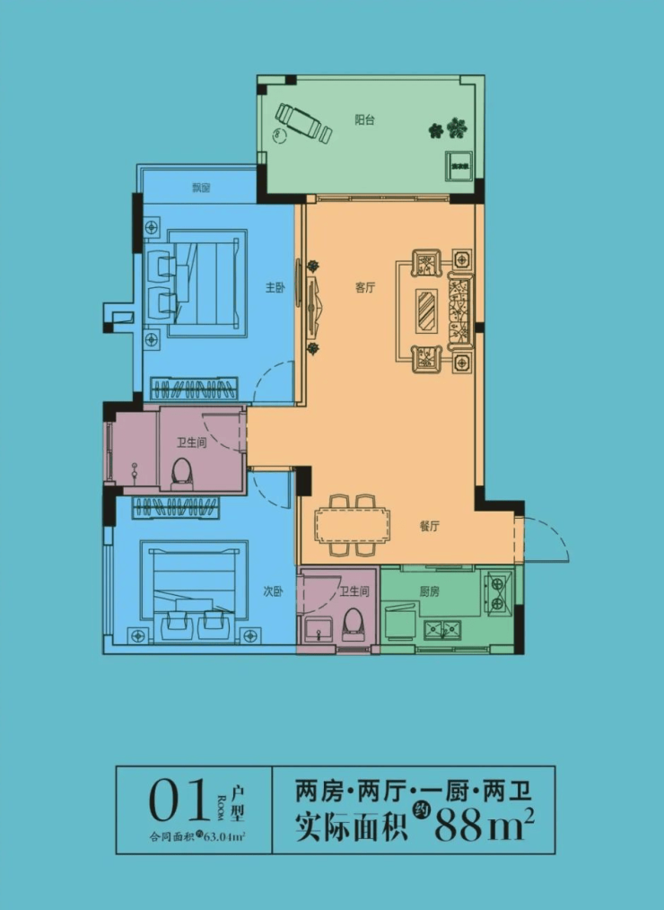 建筑面积:63平米,实得面积88平