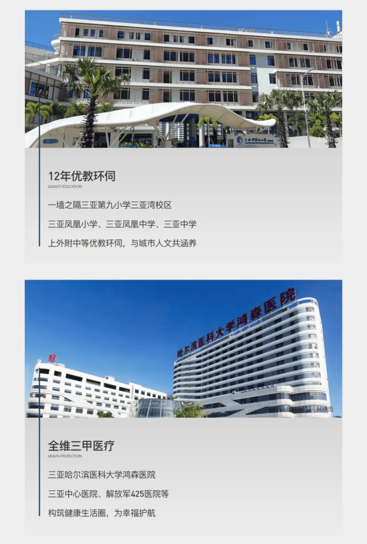 三亚哈尔滨医科大学鸿森医院、三亚中心医院、解放军 425 医院等全维三甲医疗机构林立,为业主健康保驾护航,构筑起坚实的健康防线。