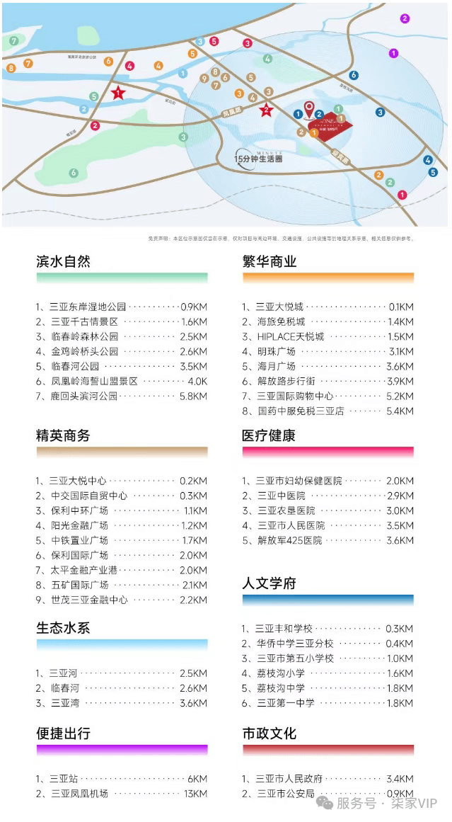 小易拿到的项目资料,也将周边的配套梳理的很全面,大悦城、免税城、中医院、华侨中学三亚分校等商业、医疗、教育配套基本上是三亚主城区的顶配;