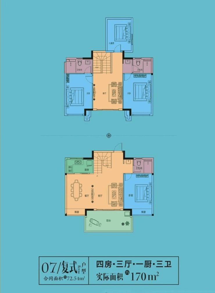 07户型:两房两厅一卫,5.4✖2.4的景观阳台,两卧室全朝阳,客厅开间3.6米