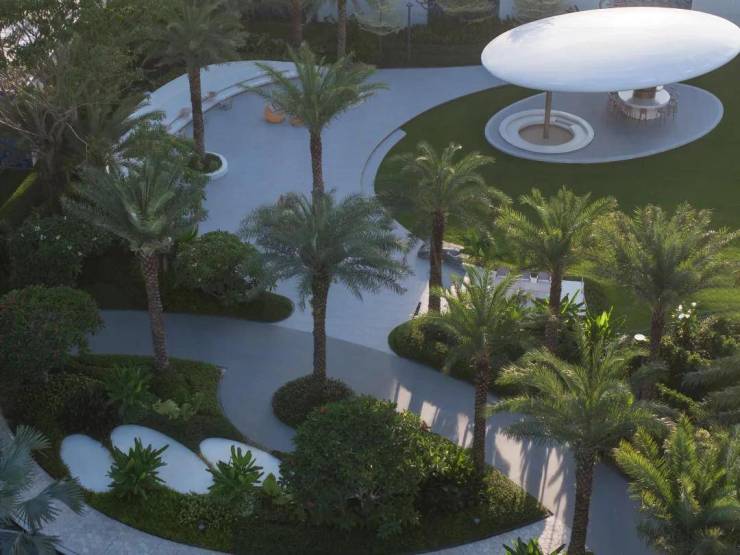 项目建筑密度低于10%,所以拥有足够的空间打造公共区域。设计团队巧妙地将高层建筑的底层架空,并通过风雨廊相连,有效地模糊了空间与自然景观之间的界限。自然形成的底层大花园成为了业主社交的绝佳场所。