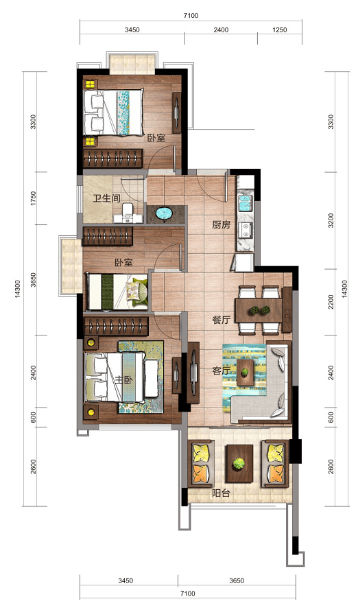 远山瞰景公寓·B户型:套内面积约64㎡,使用面积约91㎡,125万起,三室两厅一卫,海南稀缺紧凑型三房,南北通透,明厨明卫。