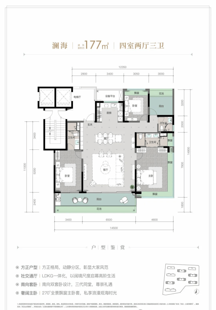 规划建筑面积约126-213㎡观海奢装大平层,约3.1米阔绰层高,部分户型创新设计270°全景飘窗主卧套、四开间朝南等,全成品高标奢装,营造全新舒居体验。