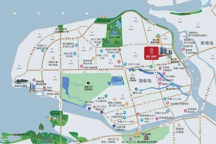 新投·熙悦里项目临近滨海景观大道--碧海大道,靠近南渡江,与江东新区隔江相望,地理位置优越。项目周边环境优美,河海景观交融,生活配套醇熟,出行便捷通畅。