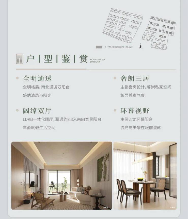 洋房 A 户型,建筑面积约 122㎡(或 124.9㎡ ),三室两厅两卫。全明通透,南北通透双阳台,主卧套房设计超有尊崇感。LDKB 一体化阔厅联通约 8.3 米南向宽景阳台,主卧还有 270° 环幕阳台,美景尽收眼底。