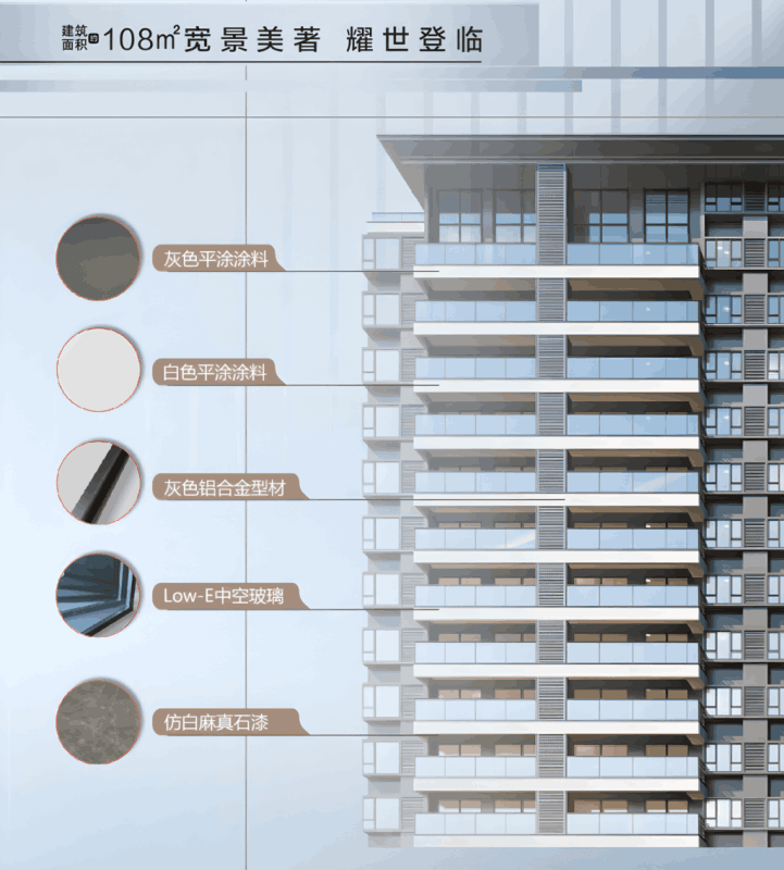 住宅立面材料:仿白麻真石漆、Low-E中空玻璃、铝合金型材、白色平涂涂料、灰色平涂涂料等。