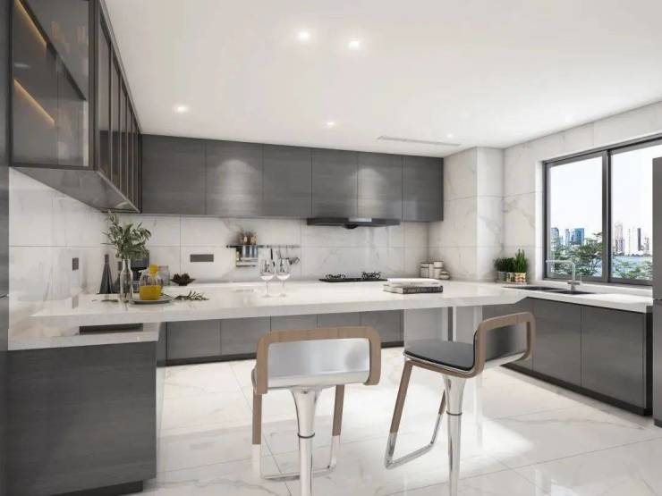 白色石膏板吊顶内嵌东芝中央空调、预留双开门冰箱位、吊柜嵌入式灯光等细节设计,映射出高品质的生活方式。