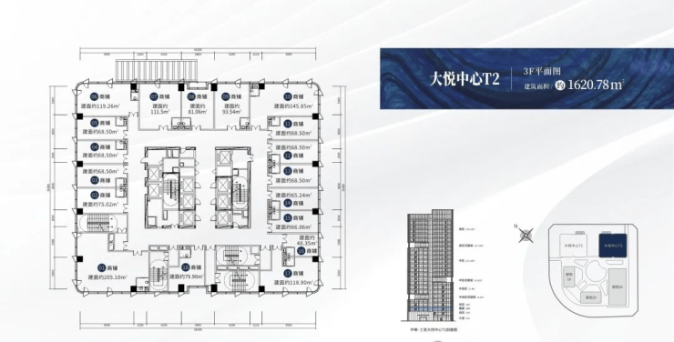 大悦中心——T3(100米写字楼)共21层,总建面约2.4万㎡,约12米建筑层高大堂,标准层高约4.2米,标准层(13-21F)建面约为1525.47㎡,分户建面约284-333㎡。