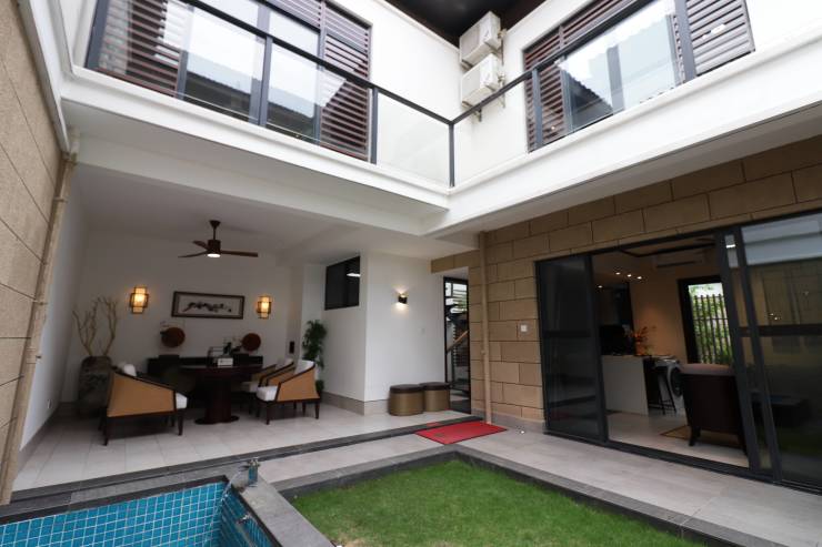 A1留云小院,套内面积约76㎡,使用面积约128㎡,220万起,两房两厅三卫,可改三房,海南稀缺小别墅,独门独院设计,一层大面积私家庭院,带温泉泡池,半敞开客厅,双卧套间。