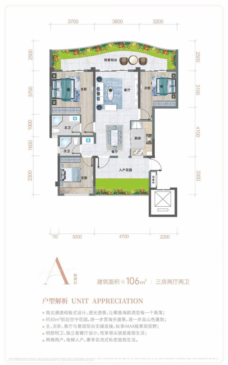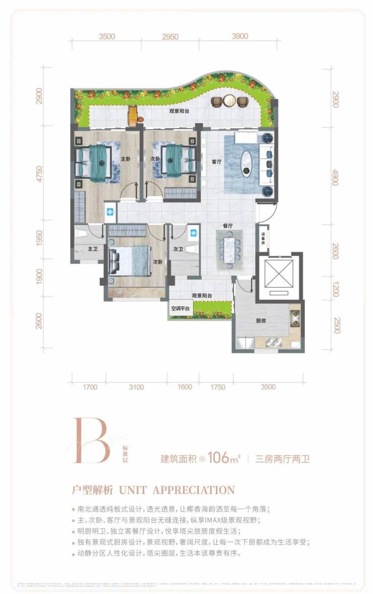 从峰层度假真实需求出发,搭配景观阳台,南北通透纯板式设计,明厨明卫,透光透景,让椰香海韵洒至每一个角落。