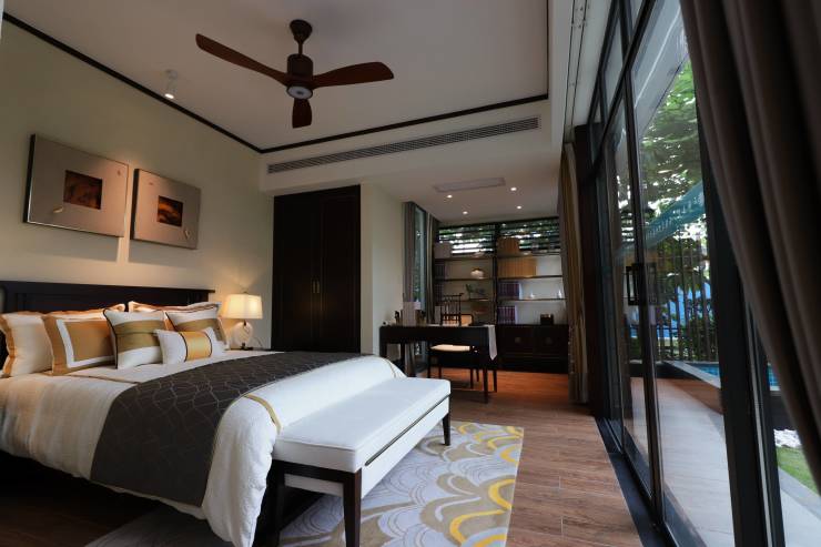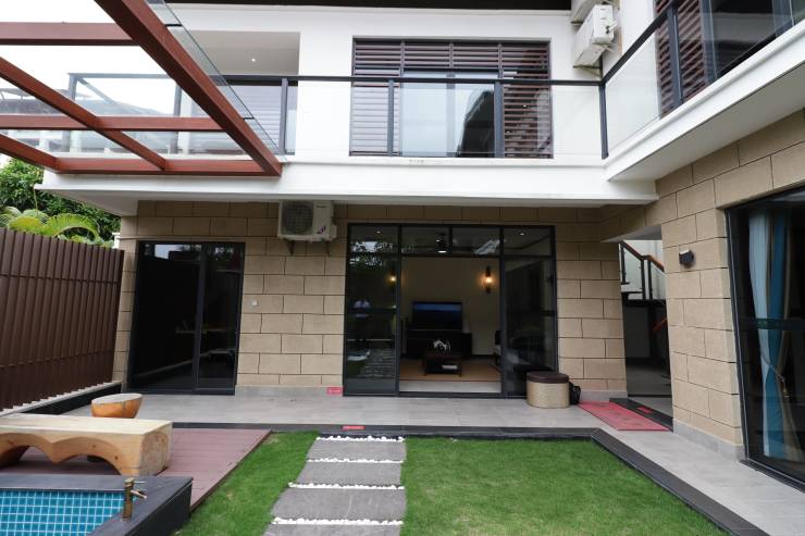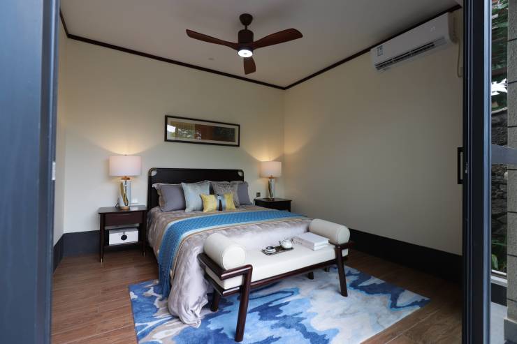 A1留云小院,套内面积约76㎡,使用面积约128㎡,220万起,两房两厅三卫,可改三房,海南稀缺小别墅,独门独院设计,一层大面积私家庭院,带温泉泡池,半敞开客厅,双卧套间。