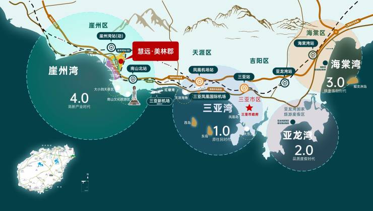 「双轨道」约200米即达三亚崖州湾站(三亚至乐东公交化旅游铁路专线,预计2023年年底通车);约5公里达崖州高铁站
