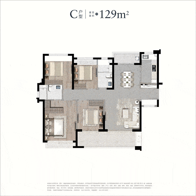 建面约129㎡C户型是个四房两厅两卫产品,动静分离、南北双阳台、三开间朝南、主卧套房带步入式衣帽间、L型厨房等布局使得室内无论是采光通风还是实用性都很强,约11.5米宽的阳台尺度感更强。