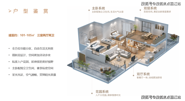 住宅用地,拥有70年产权,房屋户型设计上,延用爆款户型,纯板楼错跃式墅感洋房设计,纯板楼布局,4.8米创新错跃式设计,户型方正高拓展空间,101-105㎡三房两厅两卫的花园洋房;私属入户花园,全视野观景露台,同时一楼赠送全面积挑空层加私属入户花园,精装修拎包交付,家具家电配备齐全。