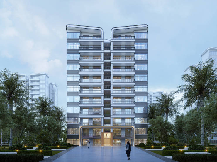 项目采用现代建筑风格设计,主题色调为浅深搭配,简洁大方,屋顶采用圆角形式,具有独特的现代感。用材上方面,整体墙面采用浅色调真石漆,搭配深灰色线条,局部门头采用金属色泽,强调出入口。