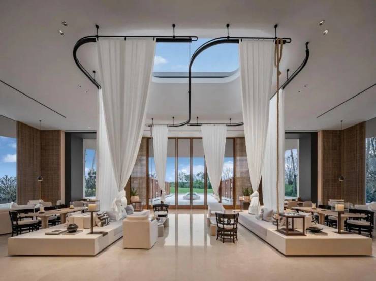 私享会所:园区配置庄园式度假会所为业主提供定制化服务,会所以石、木为主要材料基底,通过大尺寸玻璃将外部公园场景和河景资源尽收眼底,同时局部通过采光天窗将阳光引入室内,用纱幔将风的灵动传递出松弛感。