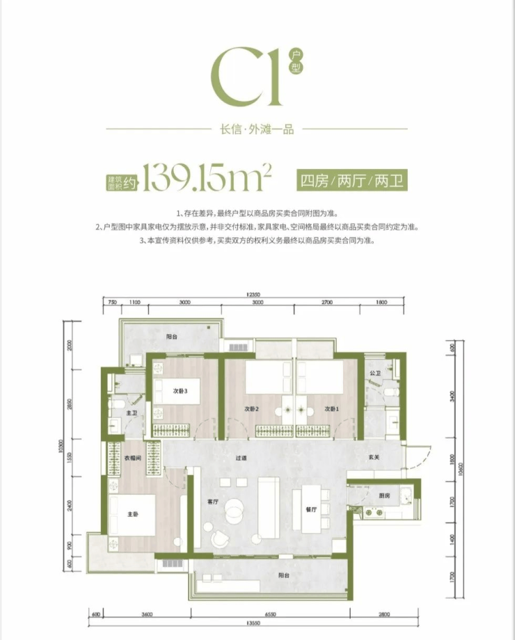 长信•外滩一品占地面积约29.77亩,总建筑面积约272593.02平方米,规划户数345户,车位充足。楼盘提供多种户型选择,包括三居室和四居室,面积在107至139平方米之间,能够满足不同家庭的需求。户型设计合理,空间利用率高,居住舒适。
