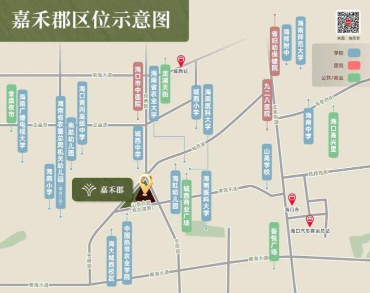 交通方面,嘉禾郡雄踞坡巷路、学院路、城西路、苍峄路等路的交汇处,这些道路串联龙昆南路、南海大道、椰海大道这三大城市主干线,可以轻松畅达城市的每个角落。