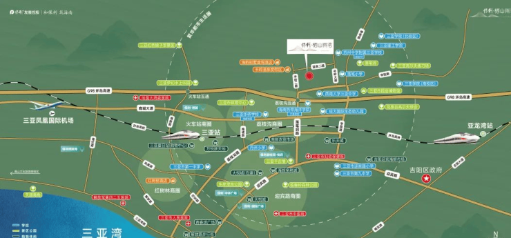 保利·栖山雨茗落址于三亚吉阳区落笔洞路北侧温泉二路,紧邻城市主干道落笔洞路及半岭大道。项目距海南环岛高速荔枝沟互通高速入口约3.9公里,距离三亚高铁站约10公里,距离三亚凤凰国际机场约17km,交通便利,可快速通达全城生活圈。