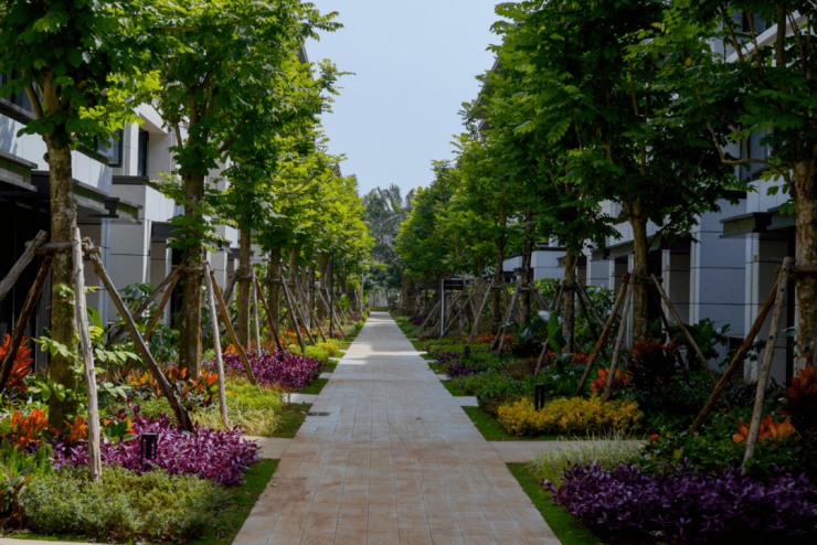 项目以“风情雨林 花间奇遇”为设计理念,打造具有热带风情度假感与花园生活感为一体的景观体验。风情水系、阳光草坪、花海长轴、鲜养慢跑道等,营造假日诗意体验。