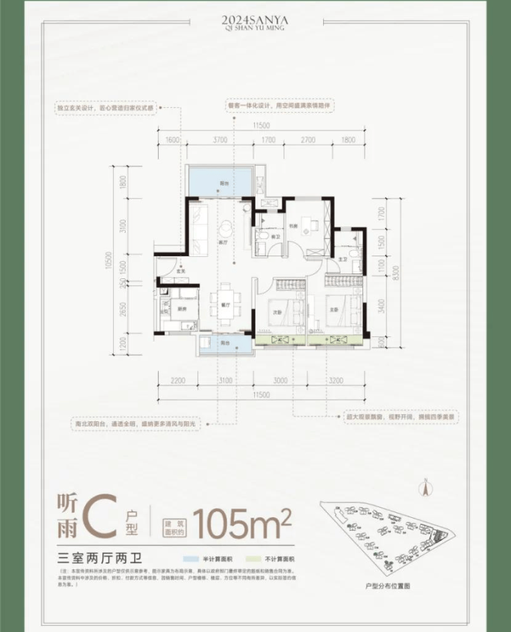 C户型:建面约105㎡,三房两厅两卫(102套)。独立玄关设计,南北双阳台,空间通透全明,超大观景飘窗,可拥揽社区四季美景。