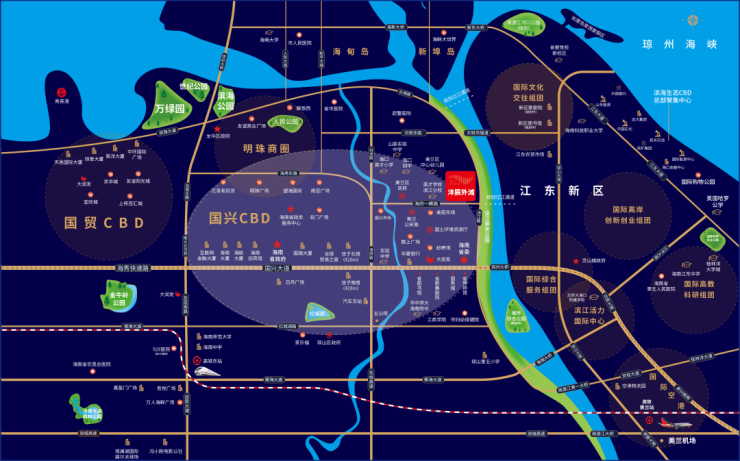 项目择址海口滨江核心区,与海南13大自贸重点园区之一—『江东新区』仅一江之隔。江东新区,海南自贸港先行试验区,按照“一港双心四组团”空间规划,打造全球未来城市样板,世界500强企业竞相入驻,成就总部经济聚集新高地。
