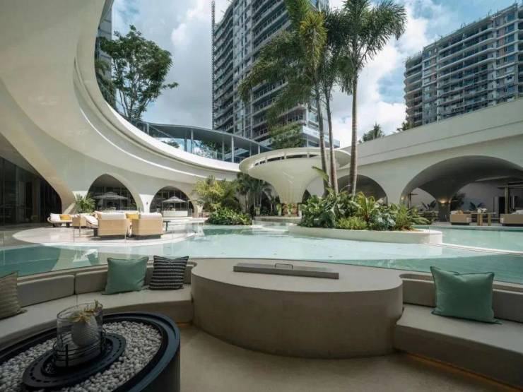 会所的立面采用了白色的曲线拱券造型,泳池从中穿过,蓝白相映,让人感受宁静而放松。作为国内首家使用迪拜风的社区会所,带来同纬度的气候和异域风情感,让住户的体验感再上一个阶层。