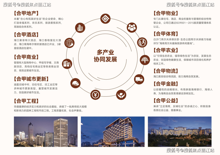 合甲集团深耕海南29载,秉承“合心构筑美好生活”的企业使命,以“聚合四海,筑甲天下”的精神,致力缔造一流城市综合服务商,集团旗下有地产、酒店、商业、城市更新、工程、物业、农业、体育、物流、金融等产业板块。