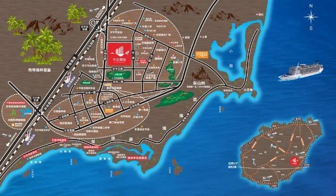 奥特莱斯国际商场、日月湾、石梅湾等几大湾区、最美公路等。项目规划有业主餐厅、运动中心、书法之家、休闲娱乐等全龄段配套,一站式开启宜居生活