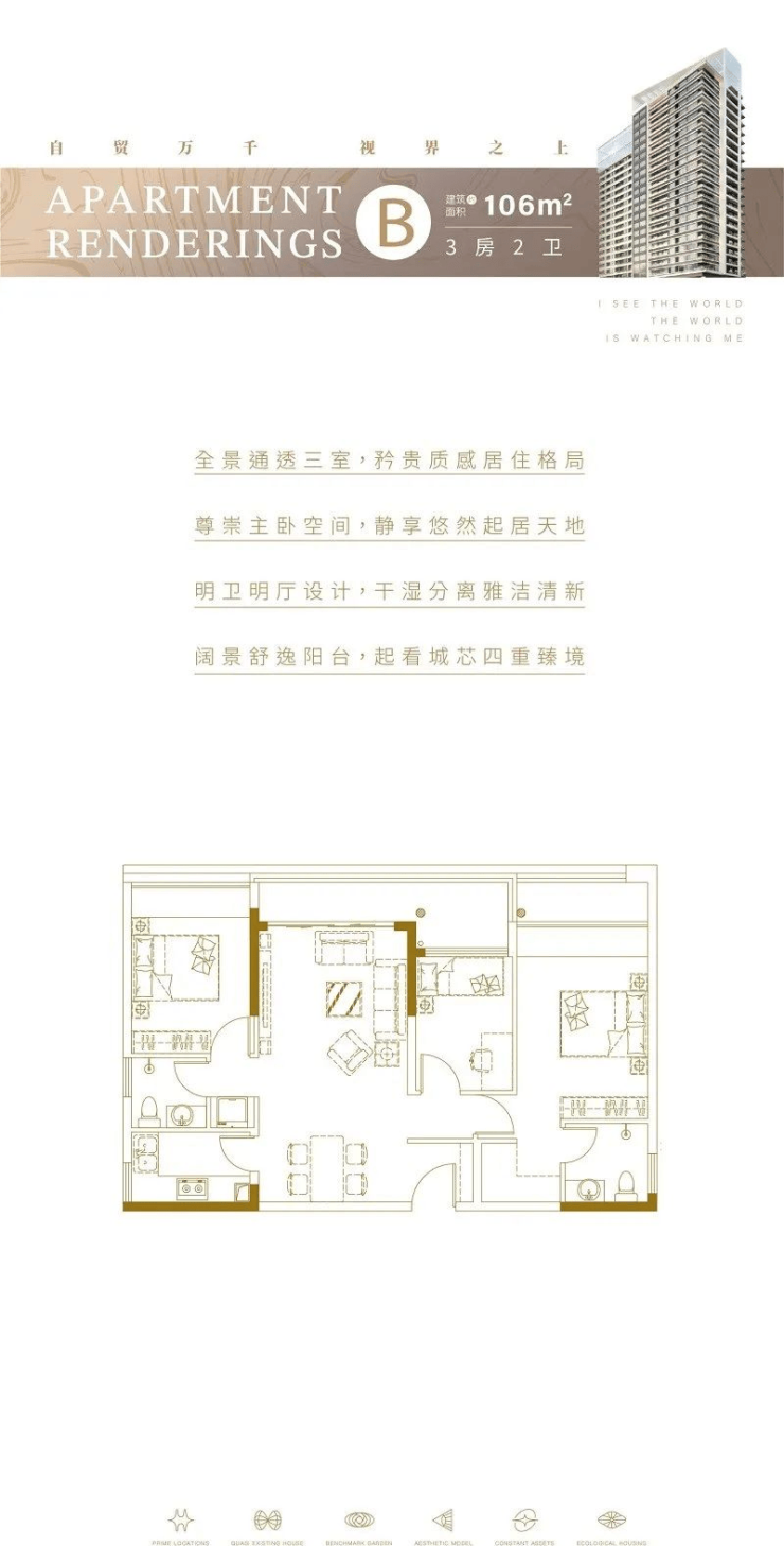 B户型:建筑面积约106㎡,三室两厅两卫。全景通透三房,每个空间都是朝明的户型,透风采光俱佳;主卧空间开阔,带独立卫生间,私密性强;独立式的L型厨房隔绝油烟;客餐厅一体化设计,约9米的观景阳台与客厅相衔接,生活自在舒逸。