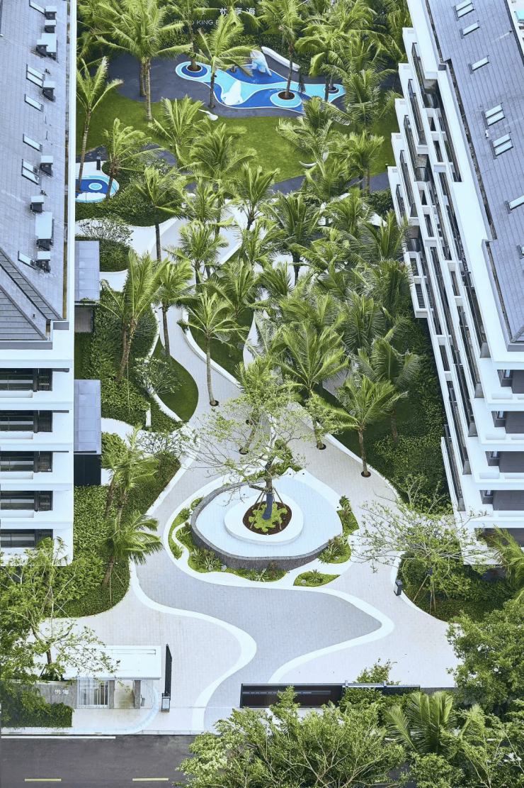 走过一系列海洋元素打造的园路,椰林,草地、景墙陆续隐现,部分墙面保留着滨海石材特有的纹理,带着些温度感,与建筑、椰林草地形成了独特的度假氛围色带。
