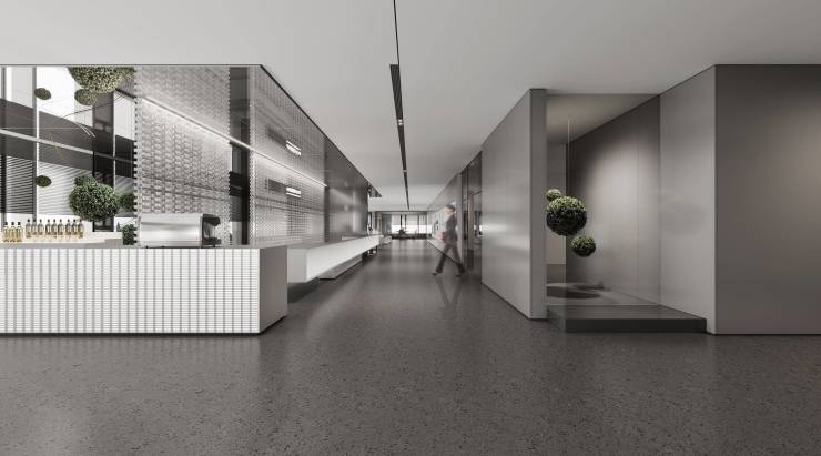 走进大楼,约11.7米的挑高大堂,搭配花岗岩地面和石膏板吊顶,高级硬朗商务气质脱颖而出。