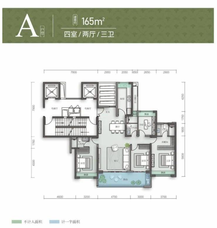 165㎡做4房3卫,专梯专户,四开间朝南,长约14.6米,南向双套房,阳台连通次卧,长约7.7米,视野开阔。