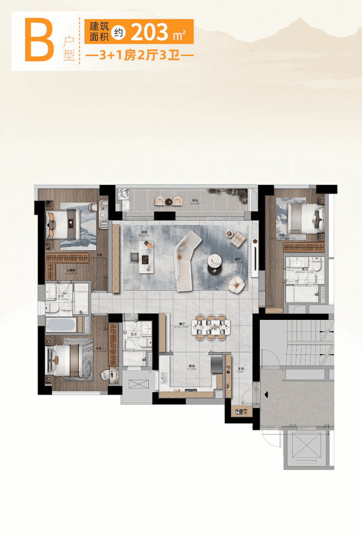 2.B户型,203㎡ 3+1房2厅3卫